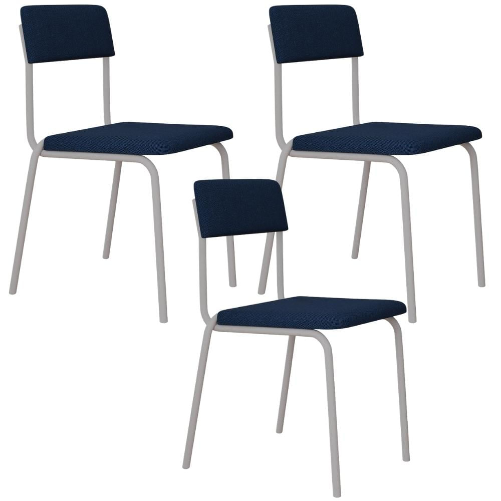 Kit 03 Cadeiras Estofada Para Sala de Jantar Sense Branco C01 Linho Azul Escuro - Lyam Decor