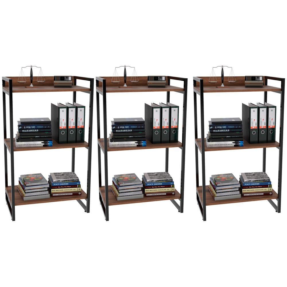 Kit 03 Estantes com 3 Prateleiras Escritório Estilo Industrial Form C01 104x60 cm Nogal - Lyam Decor
