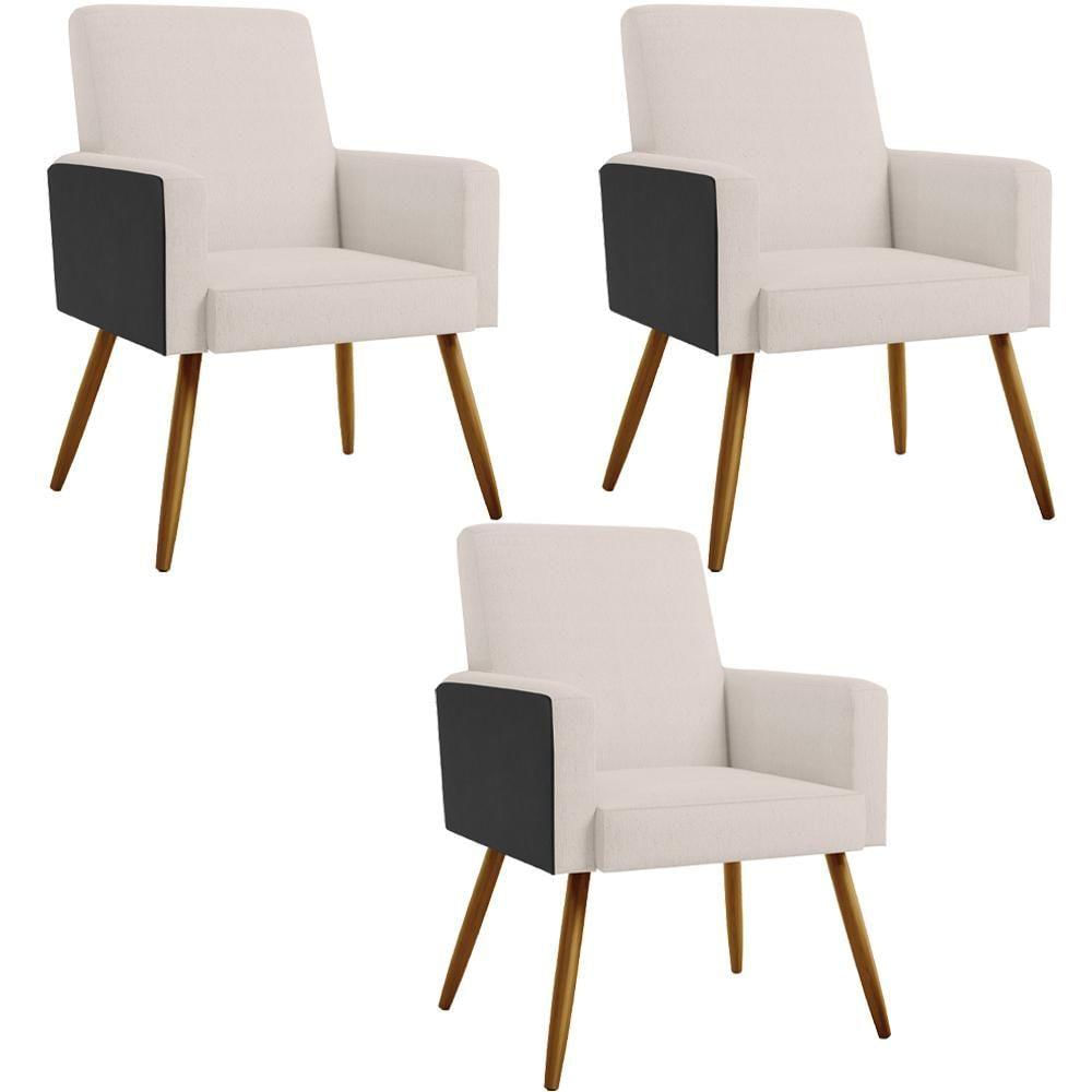 Kit 03 Poltronas Decorativa Maria W01 Pés Palito Linho Cru Couríssimo Preto - Lyam Decor