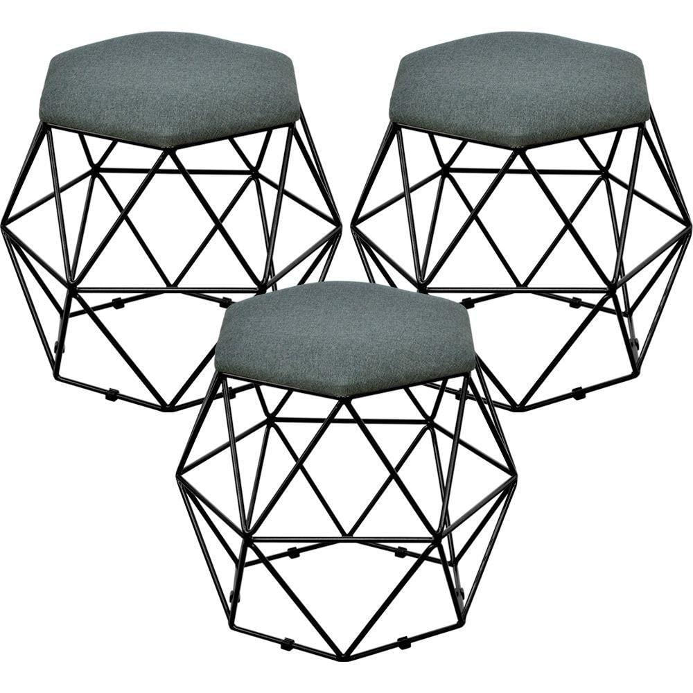 Kit 03 Puffs Decorativo Aramado Preto Six L02 Linho Chumbo - Lyam Decor Descrição do produto: É fato que a decoração com itens aramados está super em alta, e é a responsável por mudar a decoração da casa! Esbanjando estilo, o Puff Six foge do tradicional e se destaca por sua modernidade e design de extremo bom gosto. Muito forte para o estilo de decoração glam ou também para áreas externas cobertas, este Puff Decorativo cai muito bem em ambientes como sala de estar, hall de entrada, recepções, ou onde mais sua imaginação permitir. Sua estrutura não desgasta no contato com o chão pois possui proteção com sapatas plásticas, além de um assento mega confortável. O seu mais novo queridinho do ambiente e cheio de charme Puff Six. :)Dimensões do produto (L x A x P) 47 x 42 x 47 cmCaracterísticas: Estrutura em ferro 8mm com acabamento na cor Preto. Revestimento Linho Chumbo. Assento com espuma D-23. Sapatas de sustentação em polipropileno preto. Formato Hexágono Geométrico. Produto entregue montado, pronto para uso. Suporta até 180 kg.- Por se tratar de estofado as medidas podem ter uma pequena variação de até 3 cm. - A tonalidade do produto real poderá ter ligeira variação devido o lote de tecidos.Observações importantes: A montagem será de responsabilidade do comprador; Responsabilizamo-nos pela entrega em todo território nacional, até onde as rodovias alcançam, entregas fluviais ou aéreas devem ser cotadas a parte; As imagens são ilustrativas, não acompanham objetos de decoração e eletrônicos; Não nos responsabilizamos, no ato da entrega, por subir escadas/elevadores ou transporte por guincho em apartamentos. Eventuais despesas são de responsabilidade do comprador; Confira as dimensões do produto e certifique-se de que passará normalmente por supostos elevadores, portas, escadas e/ou corredores de sua residência; Altura Montado: 42 | Largura Montado: 47 | Profundidade Montado: 47