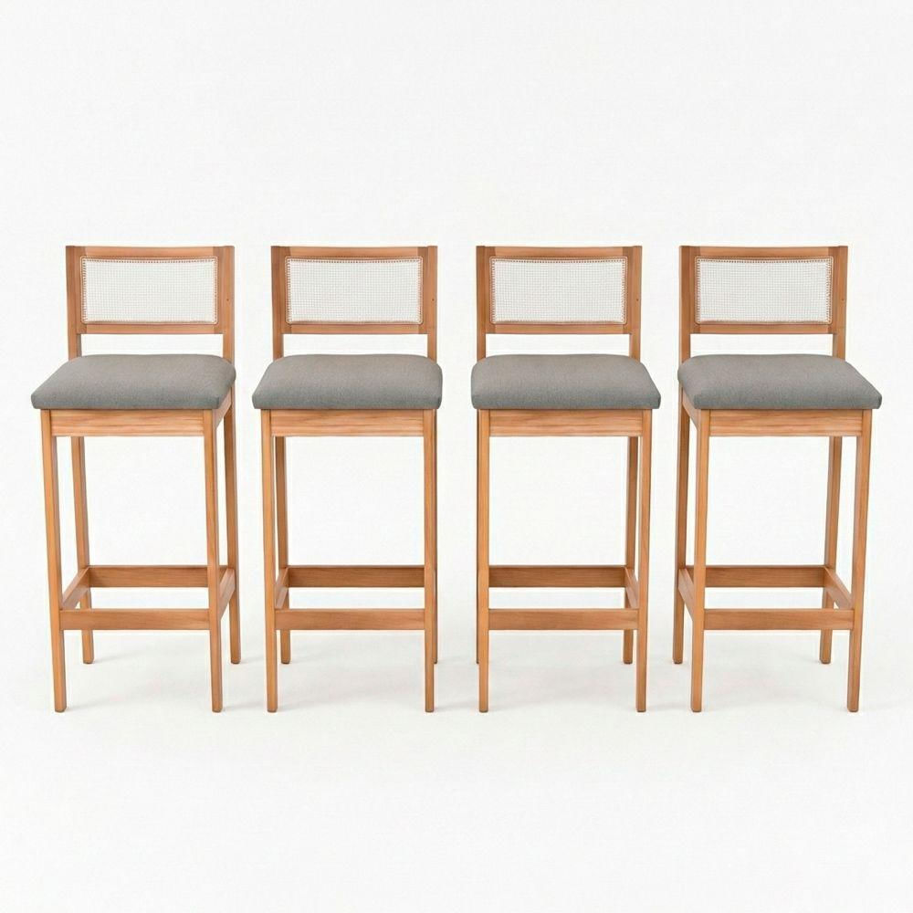 Kit 04 Banquetas Altas Brunella 99cm Com Encosto Telinha Estilo Palha Linho Cinza Claro - Desk Design