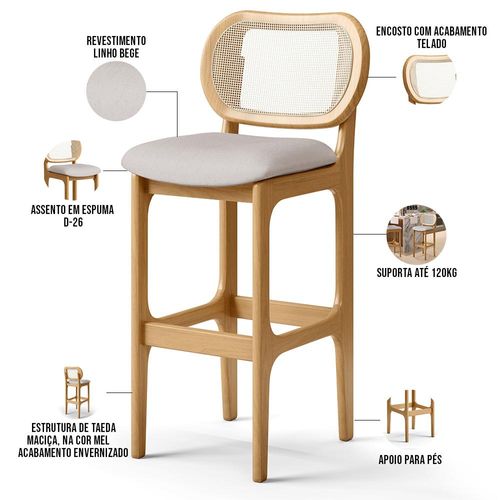 Amplamente sofisticada, a Banqueta Betta irá agregar ainda mais valor em sua decoração!! Sendo capaz de compor muito bem o ambiente, é produzida com materiais de excelente qualidade, a resistente estrutura em madeira de Taeda, na cor Mel, conta com apoio para os pés (que garante maior segurança), além do assento e encosto estofados super confortáveis e convidativos, que são revestidos em tecido Linho, extremamente elegante. Podendo ser disposta em bancada, cozinha americana, espaço gourmet ou home bar, as possibilidades de combinação são infinitas, o que a torna perfeita para receber família e amigos sempre de forma agradável e aconchegante, sem perder a sobriedade e requinte que possui. Você e seu lar merecem, adquira já a sua!! Dimensões do produto (L x A x P) 50 x 105 x 55 cm Medidas Internas: Altura do encosto: 30 cm Largura do encosto : 47 cm Altura do chão ao assento: 75 cm Largura do assento: 50 cm Profundidade do assento: 40 cm Características: Estrutura em madeira maciça de Taeda, na cor Mel com acabamento envernizado. Revestimento em Linho na cor Bege de alta qualidade, com acabamento semi brilho. Assento e encosto com espuma D-23. Acabamento em debrum no encosto. Suporta até 120 kg. Produto entregue montado. - Por se tratar de estofado as medidas podem ter uma pequena variação de até 3 cm. - A tonalidade do produto real poderá ter ligeira variação devido o lote de tecidos. - A limpeza deve ser feita com pano umedecido em água limpa, sem esfregar, não utilizar produtos abrasivos, desengordurantes, álcool ou solvente. Observações importantes: - Produto para uso residencial em ambiente interno, não devendo ficar exposto diretamente ao sol, calor e umidade excessivos. - Pode haver alguma diferença de tonalidade entre a imagem e o produto real, por conta do tratamento de imagens e a calibração de cores do seu monitor. - As imagens são meramente ilustrativas, não acompanham objetos de decoração e eletrônicos.- Ao receber a mercadoria, o cliente deve verificar as condições da embalagem, caso haja alguma avaria não assine o comprovante de recebimento. - Montagem, desmontagem e outras instalações serão de responsabilidade do cliente. Não nos responsabilizamos, no ato da entrega, por subir escadas/elevadores ou pelo transporte por guincho em apartamentos. Eventuais despesas são de responsabilidade do comprador. - Confira as dimensões do produto e certifique-se de que passará normalmente por supostos elevadores, portas, escadas e/ou corredores de sua residência.