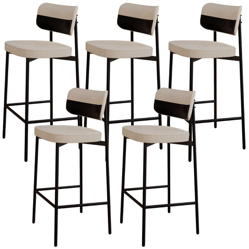 Kit 05 Banquetas Alta Bar Cozinha Sala De Jantar Aço Preto Kaira C01 Linho Areia Courino Preto - Lyam Decor