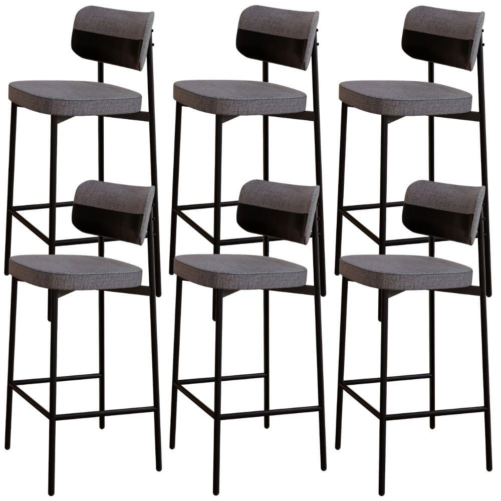 Kit 06 Banquetas Alta Bar Cozinha Sala De Jantar Aço Preto Kaira C01 Linho Cinza Courino Preto - Lyam Decor