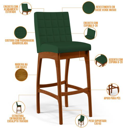 Entregando muita excelência, o Kit 06 Banquetas Altas Para Cozinha Sala de Jantar Fixa Mila B04 Suede Verde Musgo - Lyam Decor é o complemento que faltava para deixar sua casa ainda mais extraordinária. Seu encosto com costura em padrão quadriculado e assento estofados, centralizam em si uma graciosidade estonteante, sem perder todo o seu conforto. A estrutura em madeira, na cor nozes, também é digna de notoriedade, por imprimir bastante personalidade a sua decoração. Vale ressaltar ainda, o apoio para os pés que garante maior segurança à mesma.