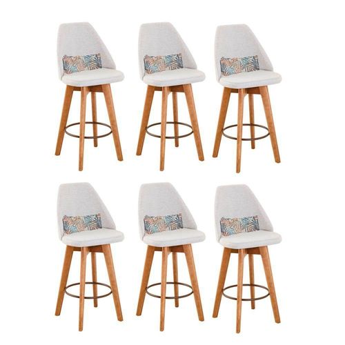 Kit 06 Banquetas Alta Maya Giratória Com Encosto Linho Bege Claro E Almofada Folhas - Gat Magazine