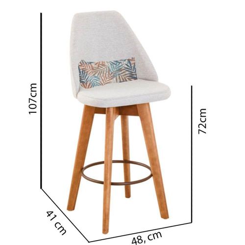 - Assento revestido com espuma D-23; - Base Giratória em madeira de Eucalipto; - Arco redondo em ferro; - Assento em tecido; - Suporta até 120kg.