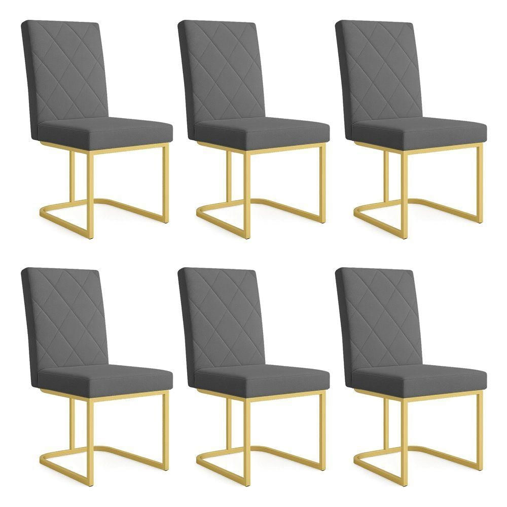 Kit 06 Cadeiras De Jantar Estofada Siena Linho Grafite Base De Ferro Dourada - Pallazio