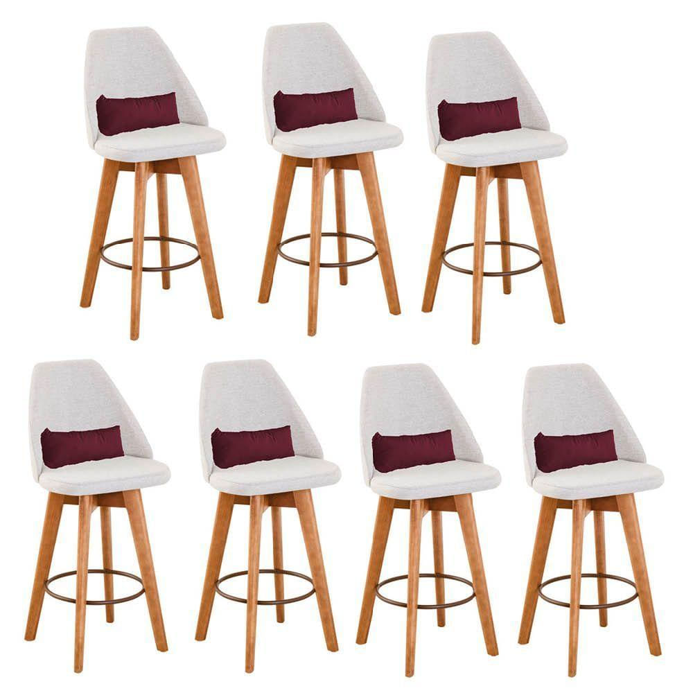 Kit 07 Banquetas Alta Maya Giratória Com Encosto Linho Bege Claro e Almofada Corino Bordô - Aurora Line