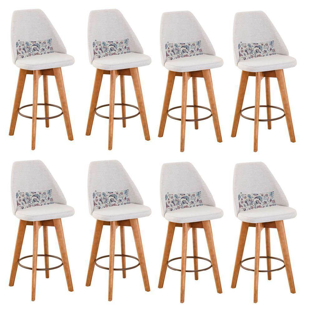 Kit 08 Banquetas Alta Maya Giratória Com Encosto Linho Bege Claro e Almofada Flores - Aurora Line