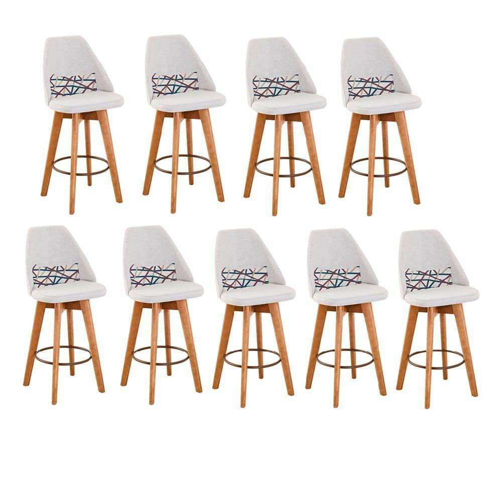 Kit 09 Banquetas Alta Maya Giratória Com Encosto Gourmet Linho Bege e Almofada Linhas Coloridas - Aurora Line
