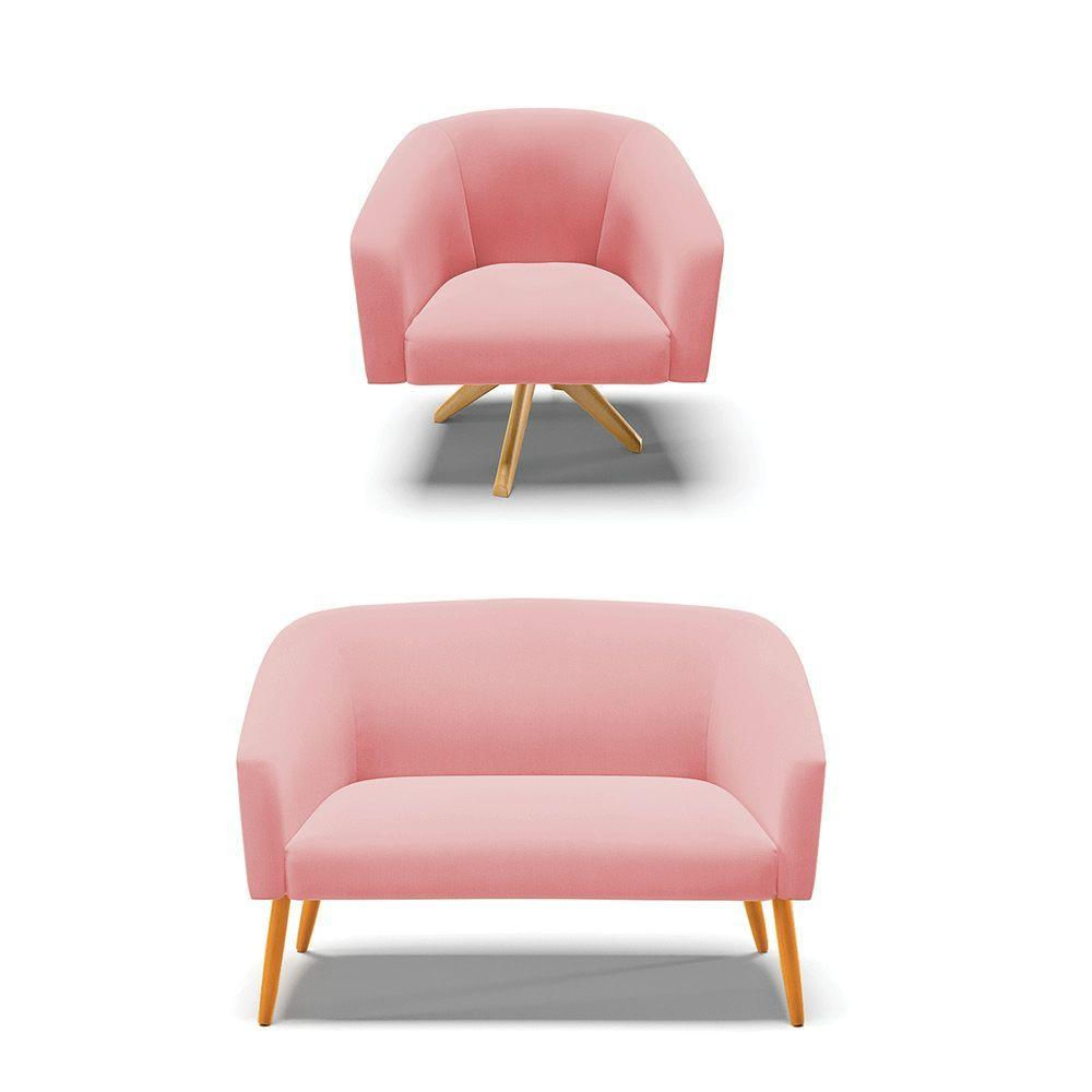 Kit 1 Namoradeira E 1 Poltrona Giratória Base Madeira Rose