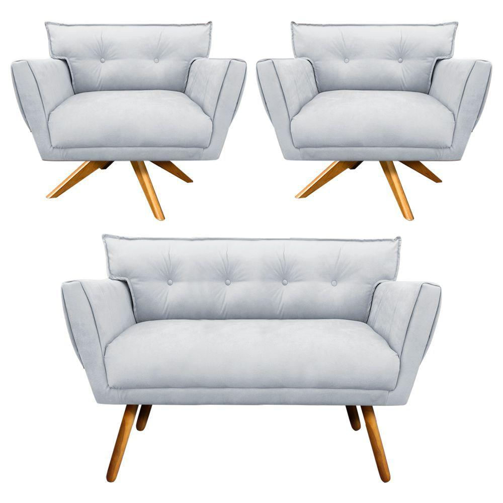 Kit 01 Namoradeira E 02 Poltronas Giratória Anitta Suede Base Madeira Ma30 D'rossi Cor Cinza