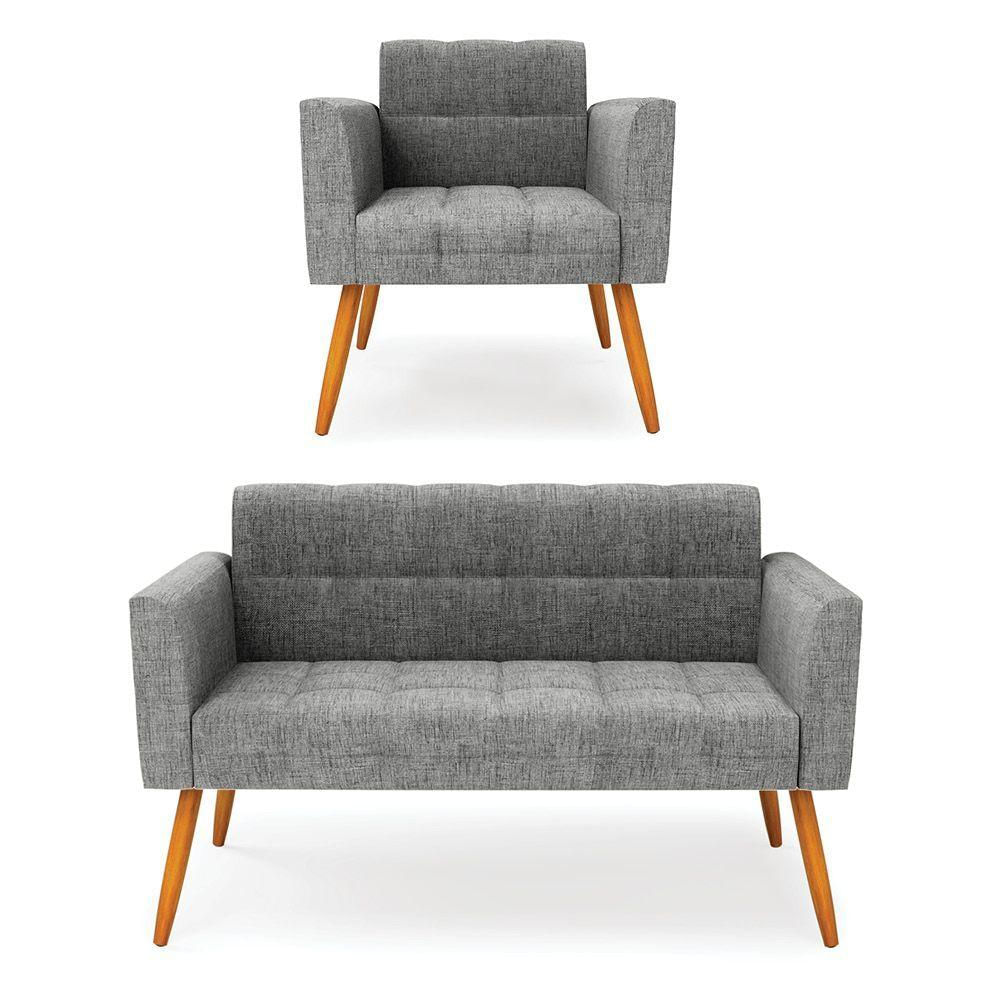 Kit 1 Sofá Namoradeira E 1 Poltrona Elisa Linho Pés Palito Castanho - D'rossi Cor A26 Grafite