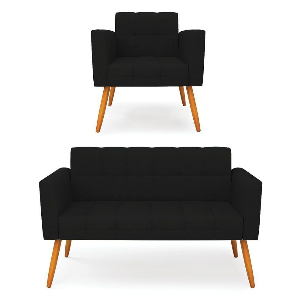 Kit 1 Sofá Namoradeira E 1 Poltrona Elisa Linho Pés Palito Castanho - D'rossi Cor A79 Preto