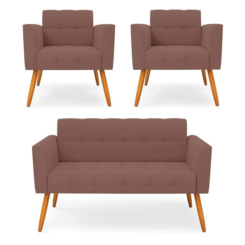 Kit 1 Sofá Namoradeira E 2 Poltronas Elisa Veludo Rosê Pés Palito Castanho - D'rossi
