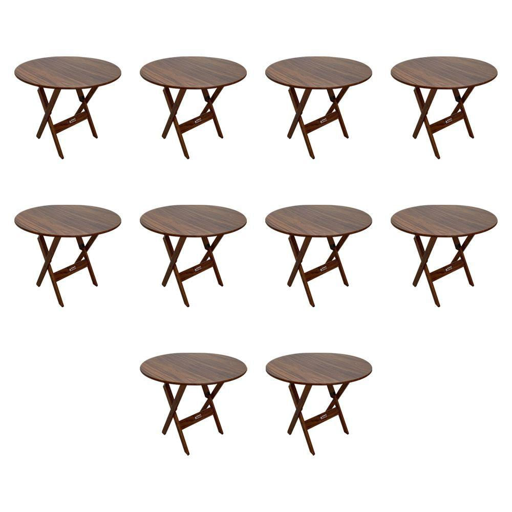 Kit 10 Mesas Dobráveis De Madeira Redonda 90cm Imbuia - TarimatãA Mesa redonda dobrável é ideal para bares, restaurantes, estabelecimentos, áreas de lazer e também para sua casa. Em madeira maciça tornando resistente e durável. Seu design permite ser encaixado em qualquer ambiente, trazendo um toque a mais para seu estabelecimento. Além de sua durabilidade, o que lhe trará conforto para servir seus clientes. Por ser dobrável torna-se mais fácil guardar, manusear e limpar o produto.CARACTERÍSTICASTipo: Mesa DobrávelModelo: RedondoCor: ImbuiaEstrutura: Base em madeira maciça de alta resistência.Tampo: MDF com acabamento de alta qualidade.DIMENSÕES DA MESAAltura: 77cmAltura fechado: 98cmDiâmetro: 90cmAtenção: EVITE USAR PRODUTOS ABRASIVOS E QUÍMICOS PARA LIMPEZA DO PRODUTO, aconselha-se o uso de pano umedecido para melhor conservação; mantenha o produto fora de chuva e sol constantes.ATENÇÃOIMAGENS MERAMENTE ILUSTRATIVAS REALIZADO EDIÇÃO, PODENDO HAVER UMA PEQUENA VARIAÇÃO DE COR DEPENDENDO DE CADA TELA OU MONITOR.Kit 10 Mesas Dobráveis de Madeira Redonda 90cm Imbuia - Tarimatã