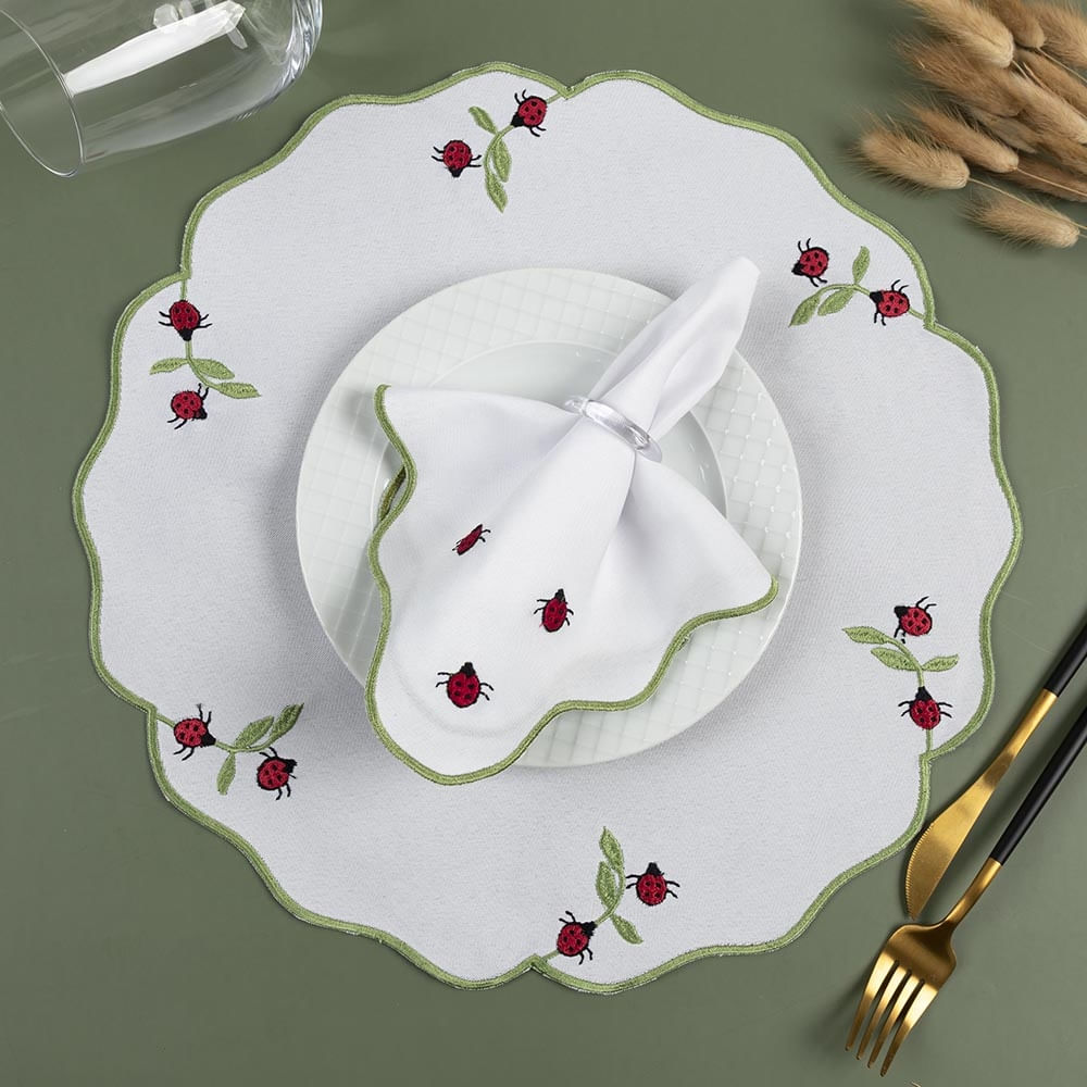 Kit 12 Jogos Americanos Guardanapos De Mesa Redondo Bordado Joaninha - Branco