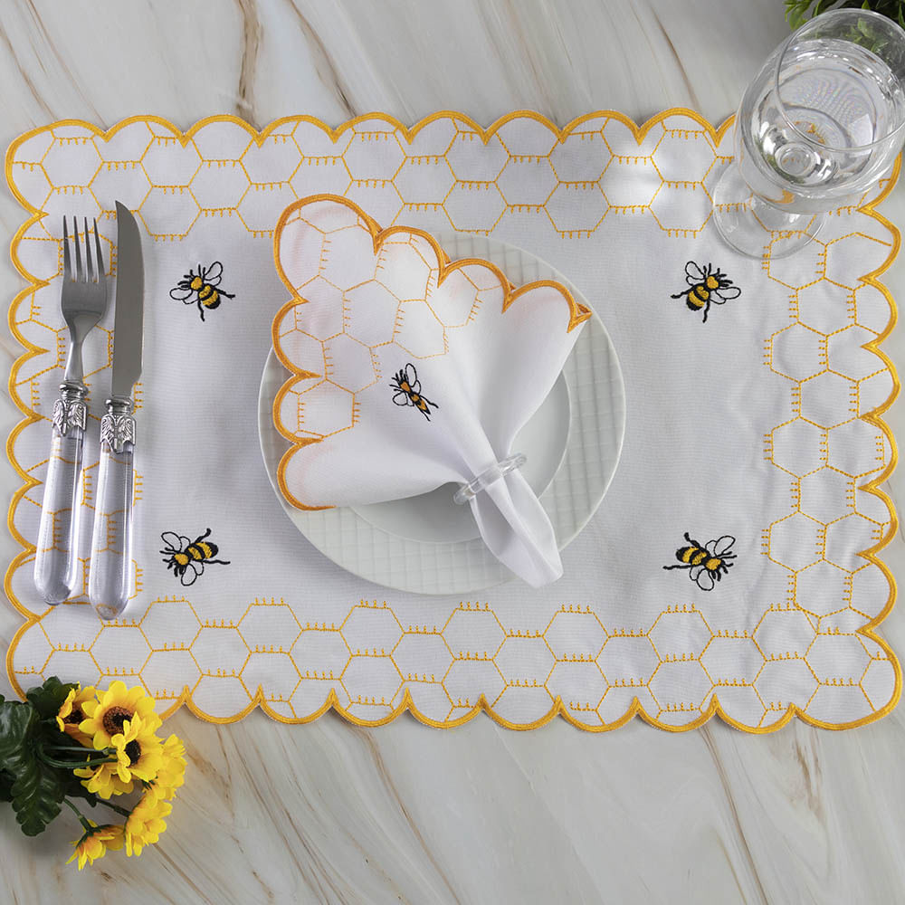 Kit 12 Jogos Americanos Guardanapos De Mesa Retangular Bordado Abelha - Branco