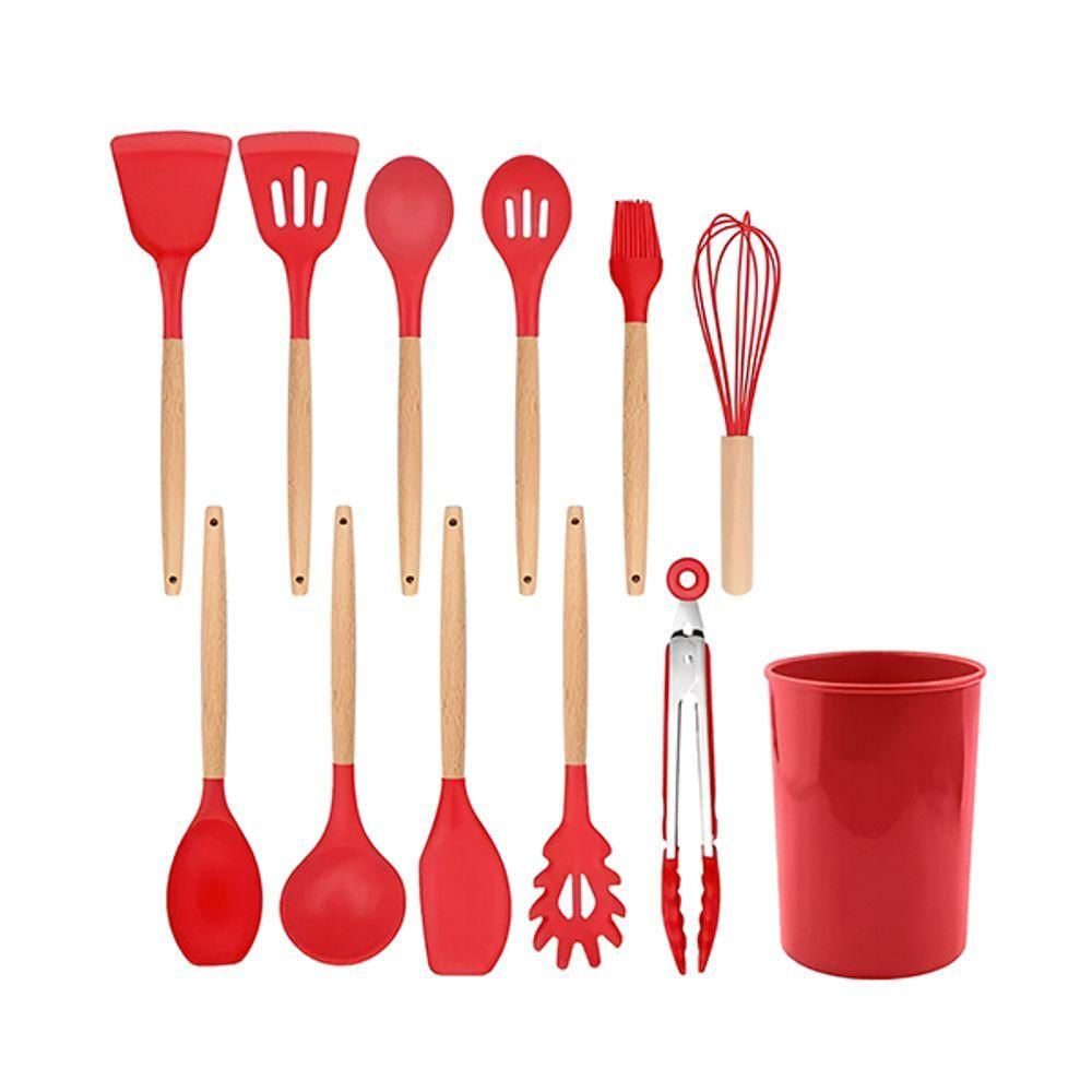 Kit 12 Utensílios Jogo De Cozinha De Silicone Com Espatulas Pincel Batedor Manual - Vermelho