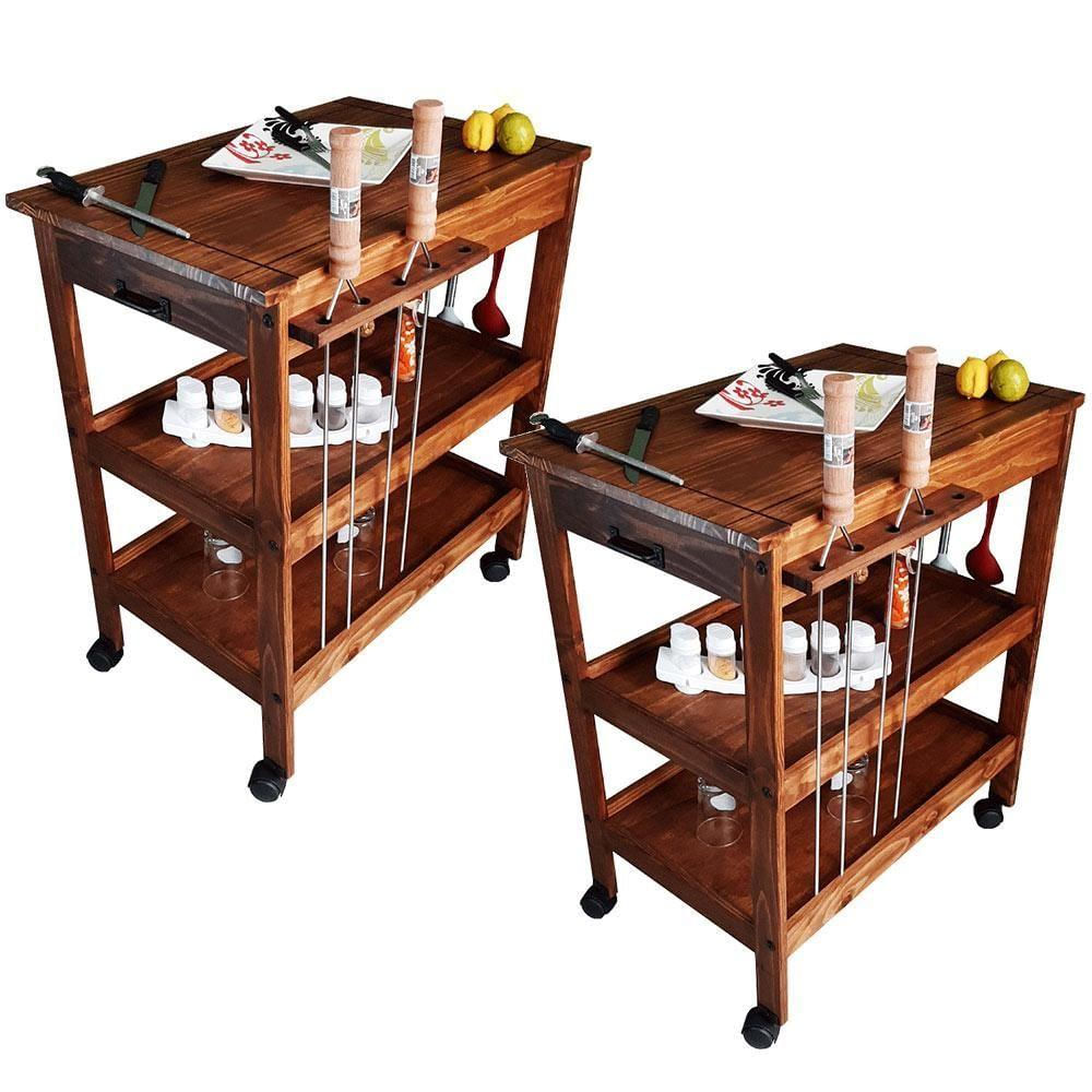 Kit 02 Carrinhos De Churrasco Mesa Gourmet Churrasqueira W02 Madeira Maciça Imbuia - Lyam Decor