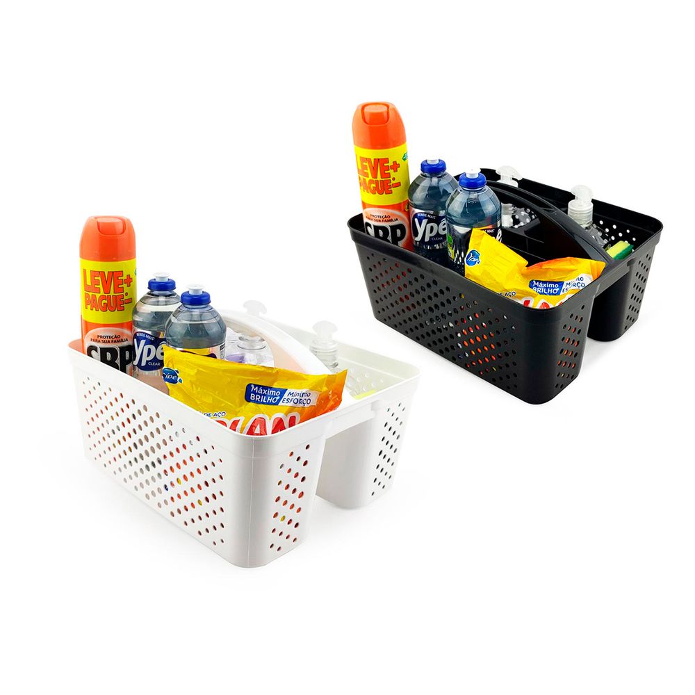 Kit 2 Cesto Organizador Transporta Tudo C/ Alça Plástico Nitron P/ Produtos de Limpeza e Ferramentas Preto/Branco