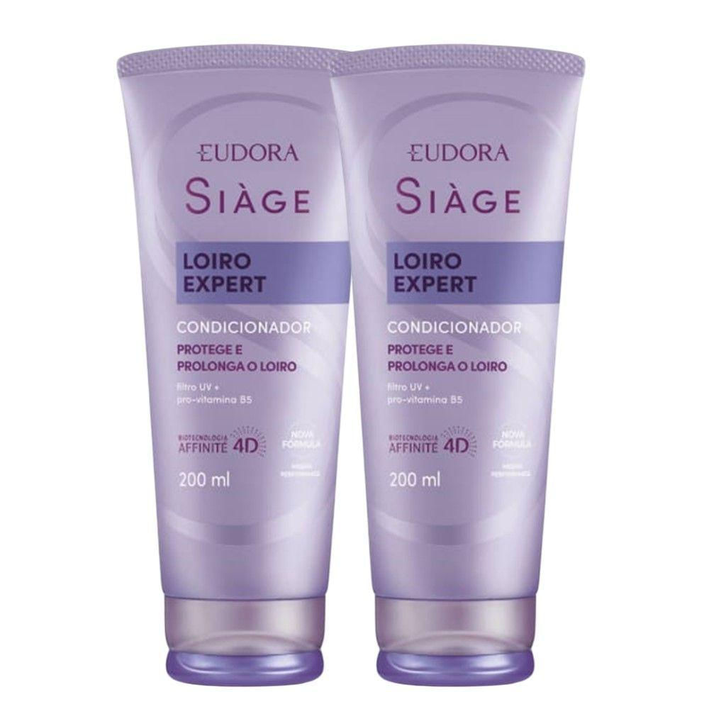Kit 2 Condicionador Matizador Loiro Expert Roxo Desamarelador Violeta Platinado 200ml Eudora SiàgeO Condicionador Desamarelador Siàge Loiro Expert entrega o melhor tratamento para seus fios descoloridos.Sua fórmula enriquecida com Filtro UV e Pro-Vitamina B5 protege os fios da exposição solar e hidrata intensamente os cabelos sem deixar que eles percam o movimento, garantindo madeixas leves, radiantes e bem cuidados por muito mais tempo.Confira seus benefícios:-Protege e aumenta a durabilidade do loiro por até 2 meses;-Protege os cabelos contra a oxidação e alteração de tons;-Restaura a elasticidade e resistência do fio;-Repara a hidratação perdida durante a química.O Condicionador Desamarelador garante cabelos super macios e com muito mais brilho.SOBRE A LINHAUma linha completa de tratamento para quem desejar ter seus loiros iluminados e protegidos. Proporcionando mais brilho e proteção desde a primeira aplicação, Siàge oferece por meio do Loiro Expert uma cor intensa e radiante por muito mais tempo. Perfeita para cabelos com luzes, mechas ou tingidos, essa linha completa une alto poder antioxidante e hidratação para preservar a cor de cada um dos seus fios.Nenhum produto Eudora é testado em animais, ou seja, este item possui selo Cruelty Free.Condicionador Matizador Loiro Expert Roxo Desamarelador Violeta Platinado 200ml Eudora SiàgeCódigo: 119871Referênica: 2620Marca: EudoraMaterial: CondicionadorCor: IncolorDimensões do produto (AxLxC): 18,00x4,50x7,50cm cada unidadeQuantidade: Kit com 2 unidades