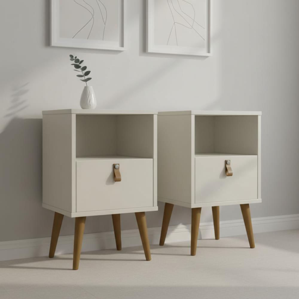 Kit 2 Mesas De Cabeceira Off White Retrô Com Gaveta E Nicho