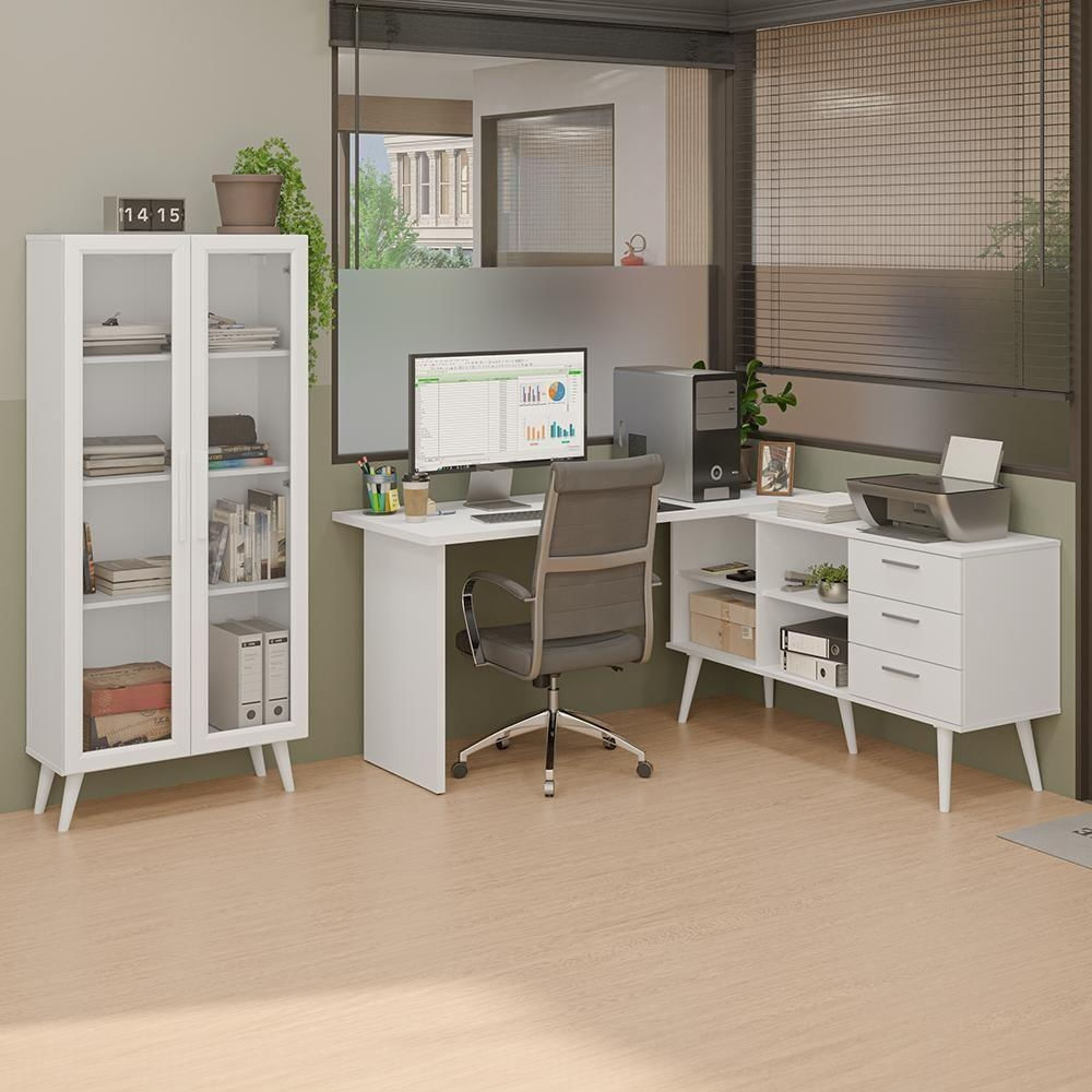 Kit 2 Peças Com Escrivaninha Em L 3 Gavetas E Armário Multiuso Com Vidro Madesa Branco
