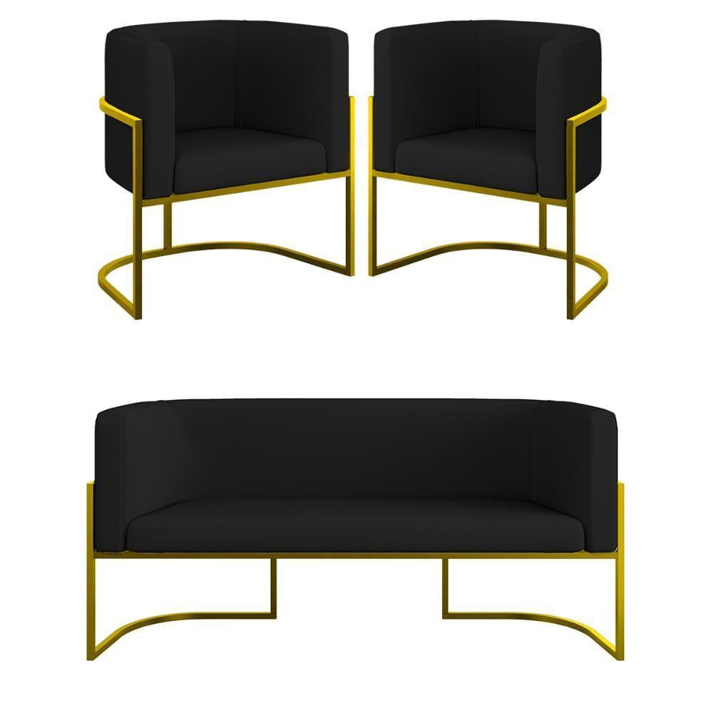Kit 2 Poltronas + Sofá 2 Lugares Base De Metal Gold Corino Preto