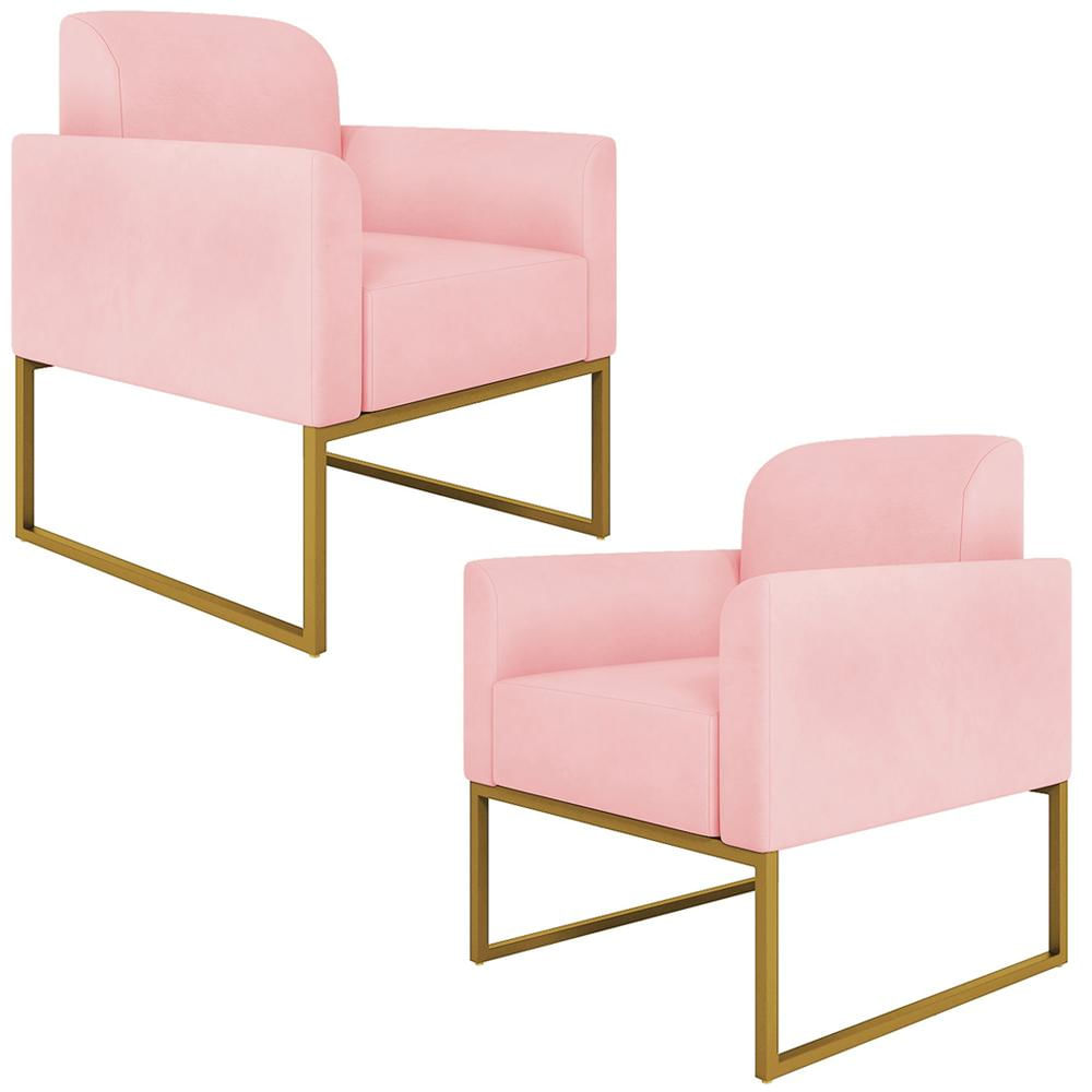 Kit 2 Poltronas Decorativas Isabella Base Industrial Suede Rosa Bebê/Dourado