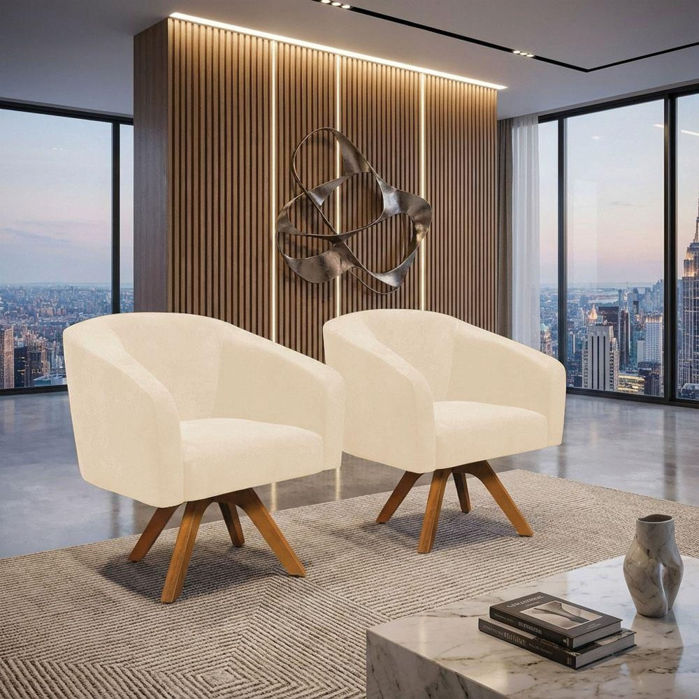 Relaxe com a poltrona D'Rossi Stella, um kit com 2 unidades giratórias em couro sintético bege ideal para compor ambientes aconchegantes. O conjunto oferece conforto equilibrado e praticidade para o uso diário, seja em casa ou em espaços profissionais. A estrutura em madeira de eucalipto com espuma de alta densidade proporciona boa sustentação ao sentar, enquanto o revestimento em sintético PU garante toque agradável. A base giratória em madeira facilita a movimentação e a interação no ambiente, contribuindo para uma experiência mais funcional. Versátil, combina com sala de estar, área de leitura, escritórios e consultórios, agregando charme e organização ao espaço.