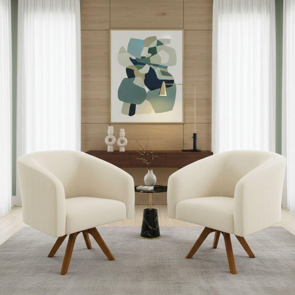 Desfrute de conforto e praticidade com a poltrona D'Rossi Stella, ideal para compor ambientes residenciais ou corporativos. O kit com 2 poltronas decorativas em veludo cotelê bege oferece toque macio e visual acolhedor para o dia a dia. A estrutura em madeira de eucalipto combinada com espumas D-26 no assento e D-23 no encosto e braços proporciona sustentação firme e uso confortável. A base giratória em madeira facilita o movimento no ambiente, tornando a interação mais dinâmica. Com design versátil, se integra facilmente a salas de estar, salas de jantar, recepções e escritórios, unindo charme e funcionalidade em um único conjunto.