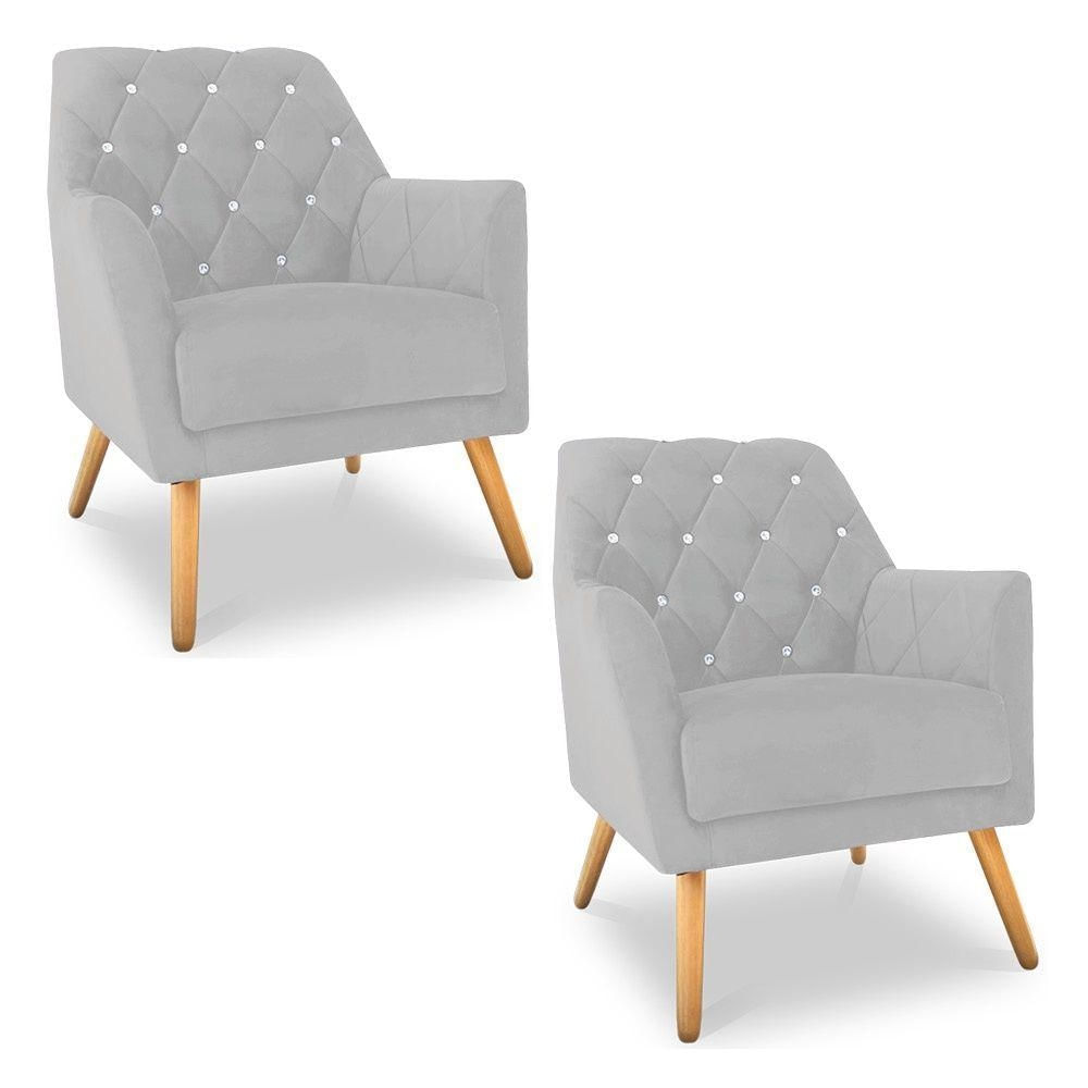 Kit 2 Poltronas Velvet Strass Veludo Pés De Madeira Cinza - Pallazio