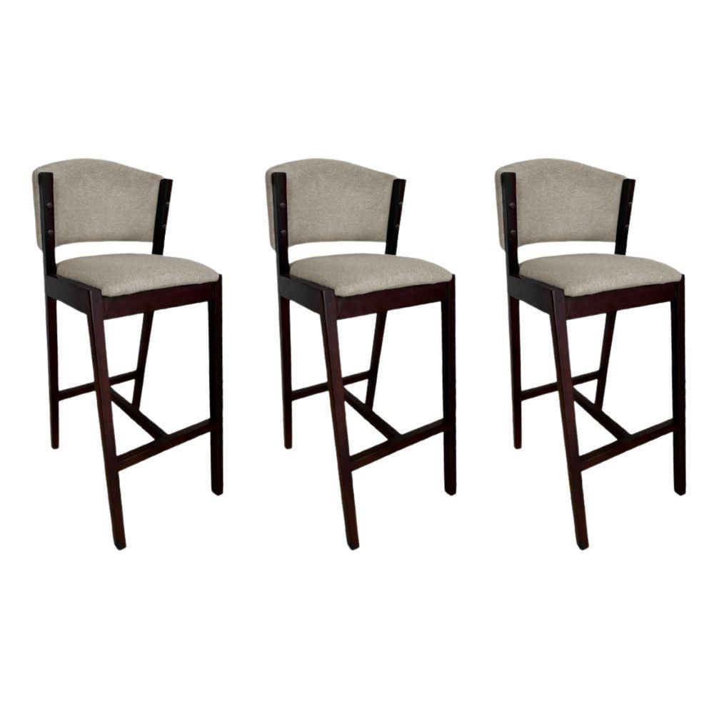 Kit 3 Banquetas Altas De Madeira Maciça Ana Em Linho Premium Bege Linho Castanho
