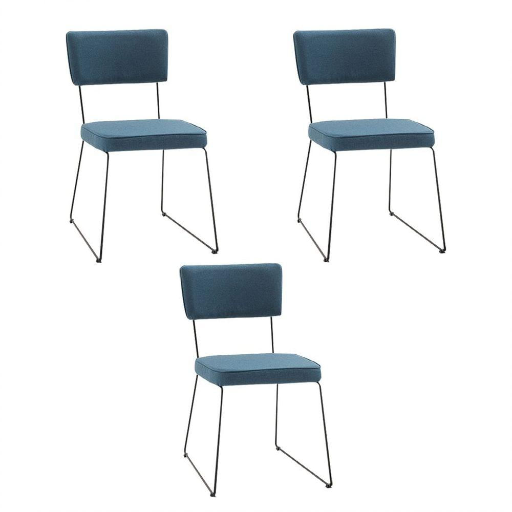 Kit 3 Cadeiras De Jantar Decorativa Base Aço Preto Luigi Linho Azul Jeans - Gran Belo