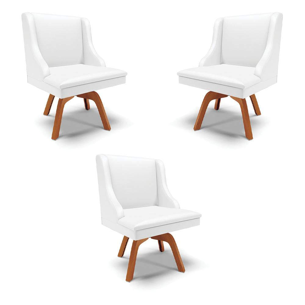 Kit 3 Cadeiras Decorativas Sala de Jantar Base Giratória de Madeira Firenze PU Branco Fosco/Natural G19 - Gran Belo