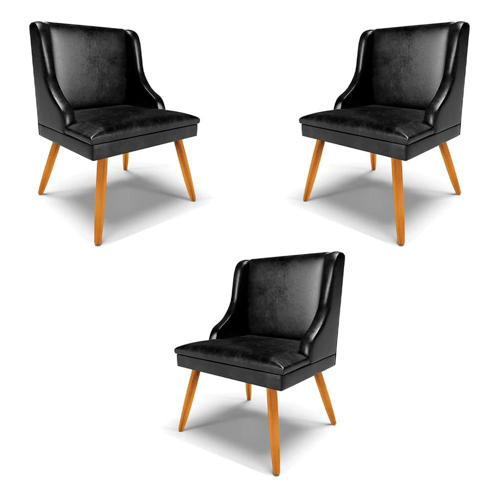 Kit 3 Cadeiras Decorativas Sala de Jantar Pés Palito de Madeira Firenze PU Preto Brilho/Natural G19 - Gran Belo