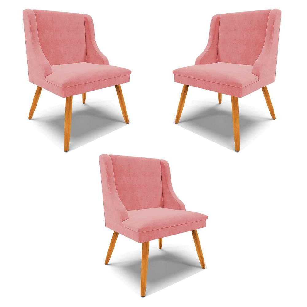 Kit 3 Cadeiras Decorativas Sala de Jantar Pés Palito de Madeira Firenze Suede Rosê/Natural G19 - Gran Belo