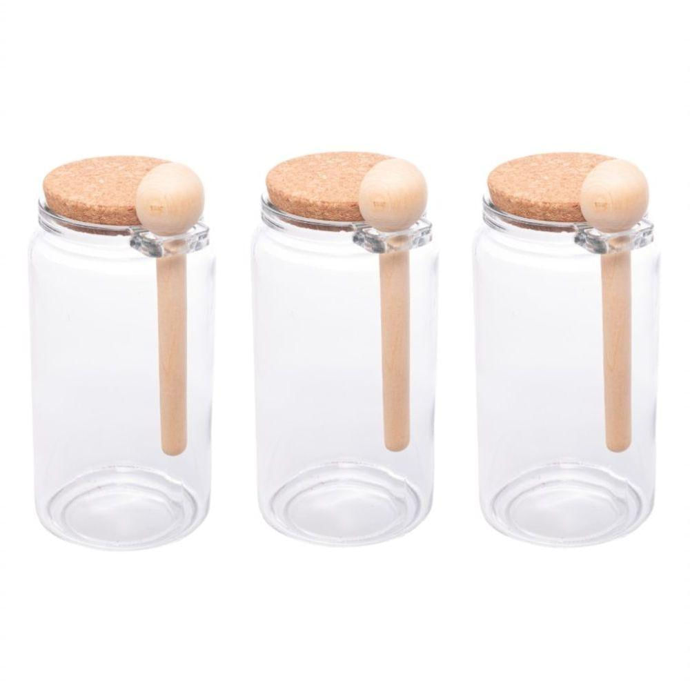 Kit 3 Porta Temperos Redondo 1 L Vidro Com Colher De Bambu E Tampa Rolha Lyor