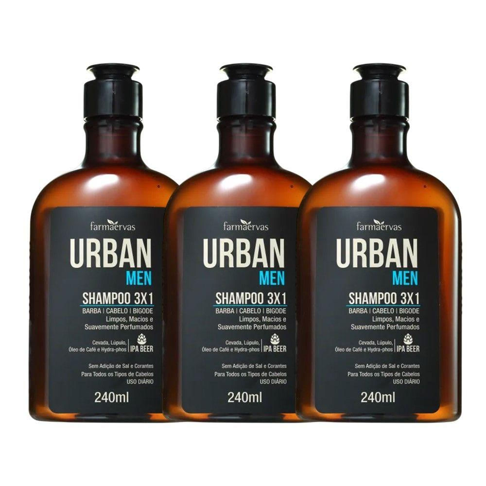 Kit 3 Shampoo 3 Em 1 Barba Cabelo Bigode Masculino 240ml Urban Men Farmaervas