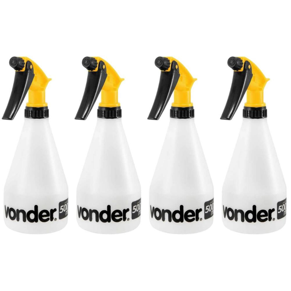 Garantia: 90 dias / Peso total: 0,300kg / Cor predominante: amarelo / Referência: 7898775144837 Dimensões de cada: 25,5cm (C) x 13cm (L) x 8,5cm (A); Capacidade de cada: 500ml; Sistema de acionamento: gatilho manual; Tipo de bico: jato regulável; Conteúdo: 4 pulverizadores borrifador; Materiais: polipropileno.