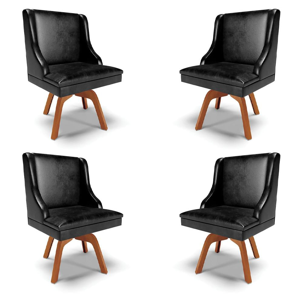 Kit 4 Cadeiras Decorativas Sala de Jantar Base Giratória de Madeira Firenze PU Preto Brilho/Natural G19 - Gran Belo