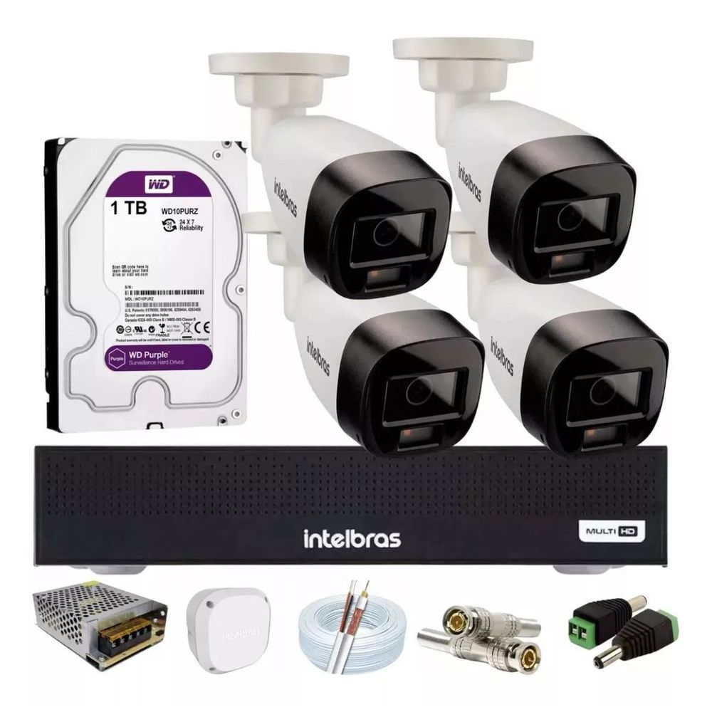 CONTEÚDO 01 DVR INTELBRAS MHDX 1004-C 1080P LITE DE 04 CANAIS COM HD 1tb purple 04 CÂMERAS INTELBRAS 1120 FULLCOLOR - HD ALTA DEFINIÇÃO 01 FONTE 12V 5 A BIVOLT 01 ROLO DE CABO COAXIAL FLEXÍVEL 4MM COM 100 METROS 08 CONECTORES BNC 04 CONECTORES P4