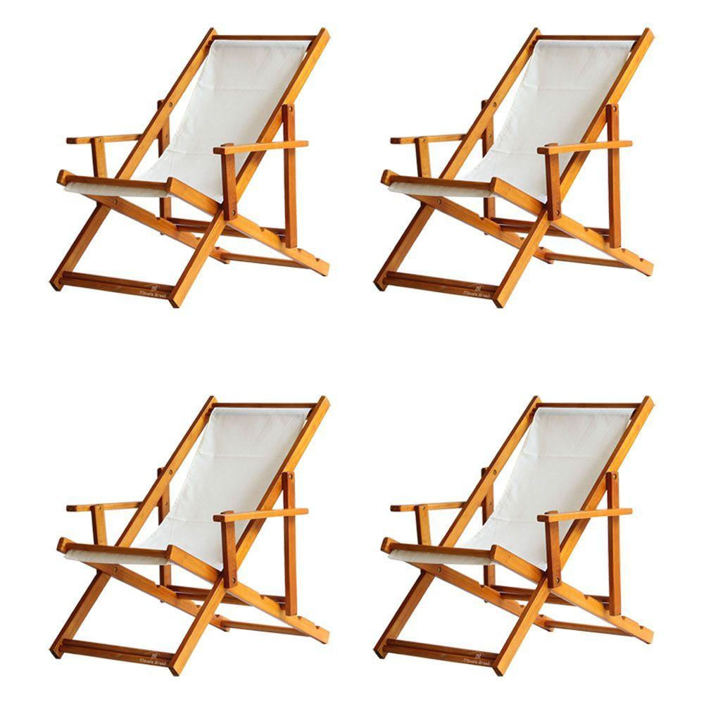 4 ESPREGUIÇADEIRAS ENVERNIZADA MEL C/B Sabe aquele final de tarde que você tanto espera para tirar um descanso merecido? Ou aquela viagem para a praia programada a meses com a família? Pois é, nossas cadeiras espreguiçadeira serve exatamente para esses momentos, com várias opções de cores, os tecidos além de charmosos são hidro-repelentes e se adequam a qualquer ambiente, facilmente removíveis para higienização.Estrutura 100% de madeira maciça de ótima qualidade, a espreguiçadeira é totalmente dobrável e reclinável (4 posições de ângulo), com descanso para braço, sendo possível montar invertida sem o encosto de braço, perfeita para seu lazer em todos os ambientes, esse é o item que definitivamente não pode faltar na vida de quem de fato, quer aproveitar bons momentos! FICHA TÉCNICA DO PRODUTO:04 Níveis de Regulagem de Altura;Tecido Reforçado;Fabricada em Madeira Maciça Pinus;Peso aproximado: 7,5 Kg;Suporta aproximadamente 120 kg;Cor da Madeira: Mel Dimensões aproximadas do Produto:Altura 1: 69 cm;Altura 2: 82 cm;Altura 3: 91 cm;Altura 4: 100 cm;Profundidade: 105 cm. Dimensão aproximada total:Comprimento: 135 cm;Largura: 66 cm; Informações Adicionais:Garantia: 90 dias contra defeitos de fabricação.Acompanha 4 cadeiras Obs. A cor pode variar da foto conforme a tonalidade da madeira e iluminação.. !!