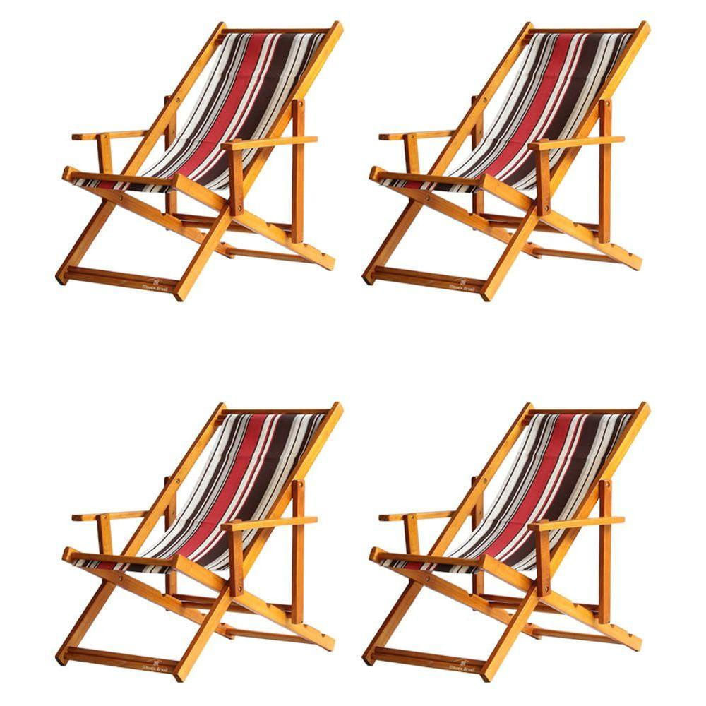 4 ESPREGUIÇADEIRAS ENVERNIZADA MEL C/B Sabe aquele final de tarde que você tanto espera para tirar um descanso merecido? Ou aquela viagem para a praia programada a meses com a família? Pois é, nossas cadeiras espreguiçadeira serve exatamente para esses momentos, com várias opções de cores, os tecidos além de charmosos são hidro-repelentes e se adequam a qualquer ambiente, facilmente removíveis para higienização.Estrutura 100% de madeira maciça de ótima qualidade, a espreguiçadeira é totalmente dobrável e reclinável (4 posições de ângulo), com descanso para braço, sendo possível montar invertida sem o encosto de braço, perfeita para seu lazer em todos os ambientes, esse é o item que definitivamente não pode faltar na vida de quem de fato, quer aproveitar bons momentos! FICHA TÉCNICA DO PRODUTO:04 Níveis de Regulagem de Altura;Tecido Reforçado;Fabricada em Madeira Maciça Pinus;Peso aproximado: 7,5 Kg;Suporta aproximadamente 120 kg;Cor da Madeira: Mel Dimensões aproximadas do Produto:Altura 1: 69 cm;Altura 2: 82 cm;Altura 3: 91 cm;Altura 4: 100 cm;Profundidade: 105 cm. Dimensão aproximada total:Comprimento: 135 cm;Largura: 66 cm; Informações Adicionais:Garantia: 90 dias contra defeitos de fabricação.Acompanha 4 cadeiras Obs. A cor pode variar da foto conforme a tonalidade da madeira e iluminação.. !!