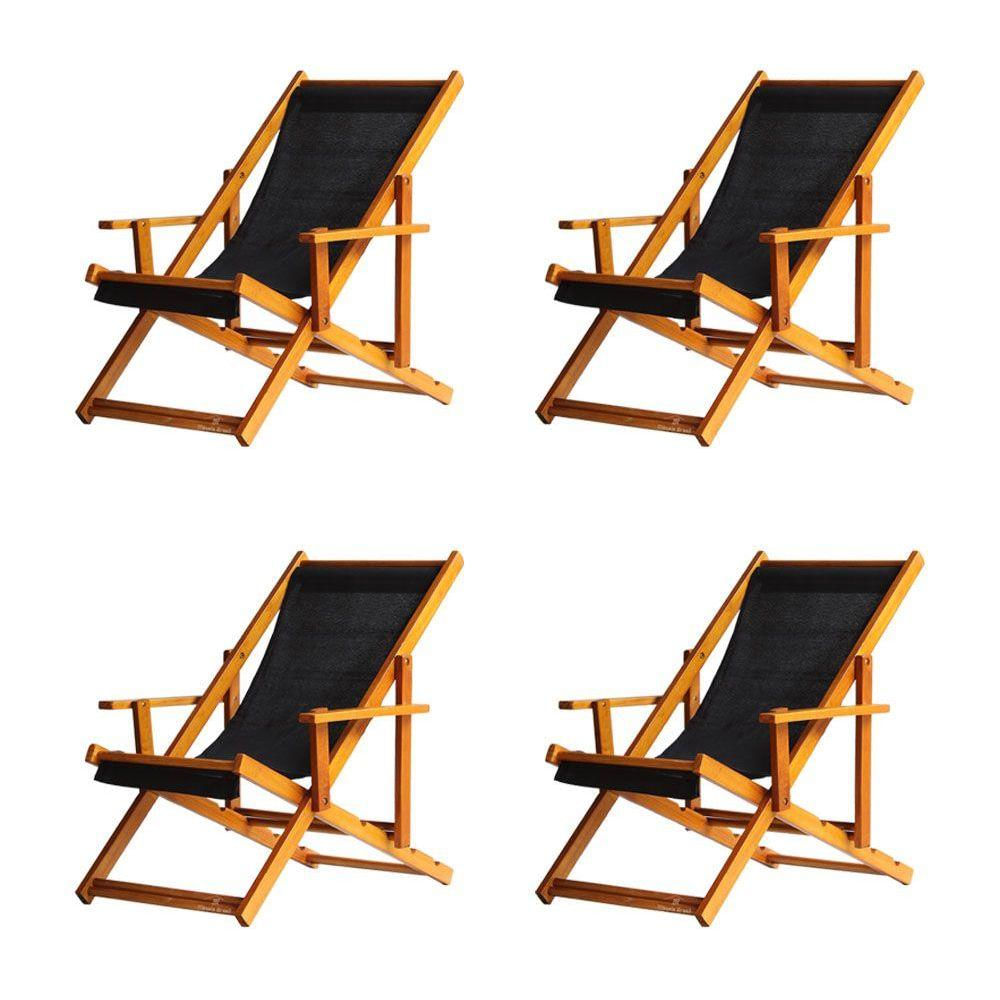 4 ESPREGUIÇADEIRAS ENVERNIZADA MEL C/B Sabe aquele final de tarde que você tanto espera para tirar um descanso merecido? Ou aquela viagem para a praia programada a meses com a família? Pois é, nossas cadeiras espreguiçadeira serve exatamente para esses momentos, com várias opções de cores, os tecidos além de charmosos são hidro-repelentes e se adequam a qualquer ambiente, facilmente removíveis para higienização.Estrutura 100% de madeira maciça de ótima qualidade, a espreguiçadeira é totalmente dobrável e reclinável (4 posições de ângulo), com descanso para braço, sendo possível montar invertida sem o encosto de braço, perfeita para seu lazer em todos os ambientes, esse é o item que definitivamente não pode faltar na vida de quem de fato, quer aproveitar bons momentos! FICHA TÉCNICA DO PRODUTO:04 Níveis de Regulagem de Altura;Tecido Reforçado;Fabricada em Madeira Maciça Pinus;Peso aproximado: 7,5 Kg;Suporta aproximadamente 120 kg;Cor da Madeira: Mel Dimensões aproximadas do Produto:Altura 1: 69 cm;Altura 2: 82 cm;Altura 3: 91 cm;Altura 4: 100 cm;Profundidade: 105 cm. Dimensão aproximada total:Comprimento: 135 cm;Largura: 66 cm; Informações Adicionais:Garantia: 90 dias contra defeitos de fabricação.Acompanha 4 cadeiras Obs. A cor pode variar da foto conforme a tonalidade da madeira e iluminação.. !!