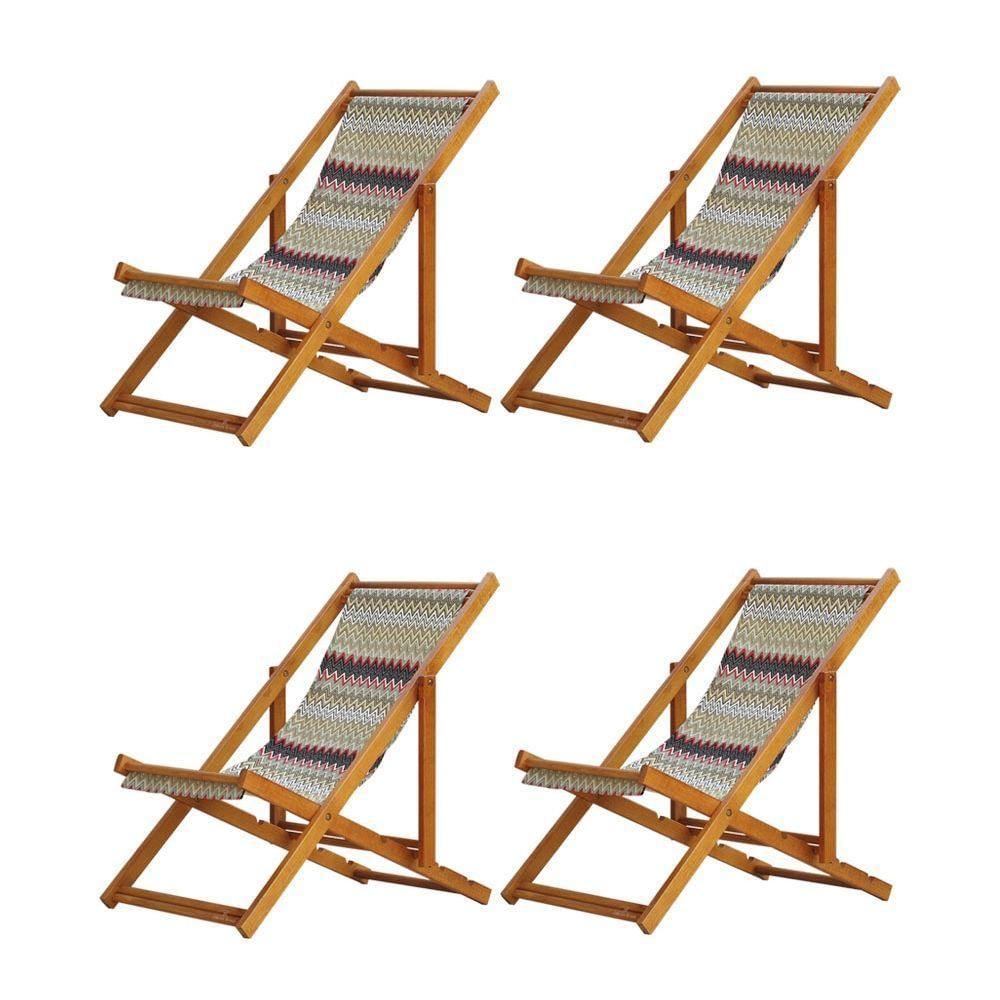 4 ESPREGUIÇADEIRAS ENVERNIZADA MEL S/B Sabe aquele final de tarde que você tanto espera para tirar um descanso merecido? Ou aquela viagem para a praia programada a meses com a família? Pois é, nossas cadeiras espreguiçadeira serve exatamente para esses momentos, com várias opções de cores, os tecidos além de charmosos são hidro-repelentes e se adequam a qualquer ambiente, facilmente removíveis para higienização.Estrutura 100% de madeira maciça e verniz especial, que garante sua qualidade e durabilidade, a espreguiçadeira é totalmente dobrável e reclinável (4 posições de ângulo), perfeita para seu lazer em todos os ambientes, seja ele externo ou interno, esse é o item que definitivamente não pode faltar na vida de quem de fato, quer aproveitar bons momentos! FICHA TÉCNICA DO PRODUTO:04 Níveis de Regulagem de Altura;Tecido Reforçado;Fabricada em Madeira Maciça Pinus;Peso aproximado: 7,5 Kg;Suporta aproximadamente 120 kg;Cor da Madeira: Mel;Acabamento: Envernizada Dimensões aproximadas do Produto:Altura 1: 69 cm;Altura 2: 82 cm;Altura 3: 91 cm;Altura 4: 100 cm;Profundidade: 105 cm. Dimensão aproximada total:Comprimento: 135 cm;Largura: 60 cm; Informações Adicionais:Garantia: 90 dias contra defeitos de fabricação.Acompanha 4 cadeiras Obs. A cor pode variar da foto conforme a tonalidade da madeira e iluminação..