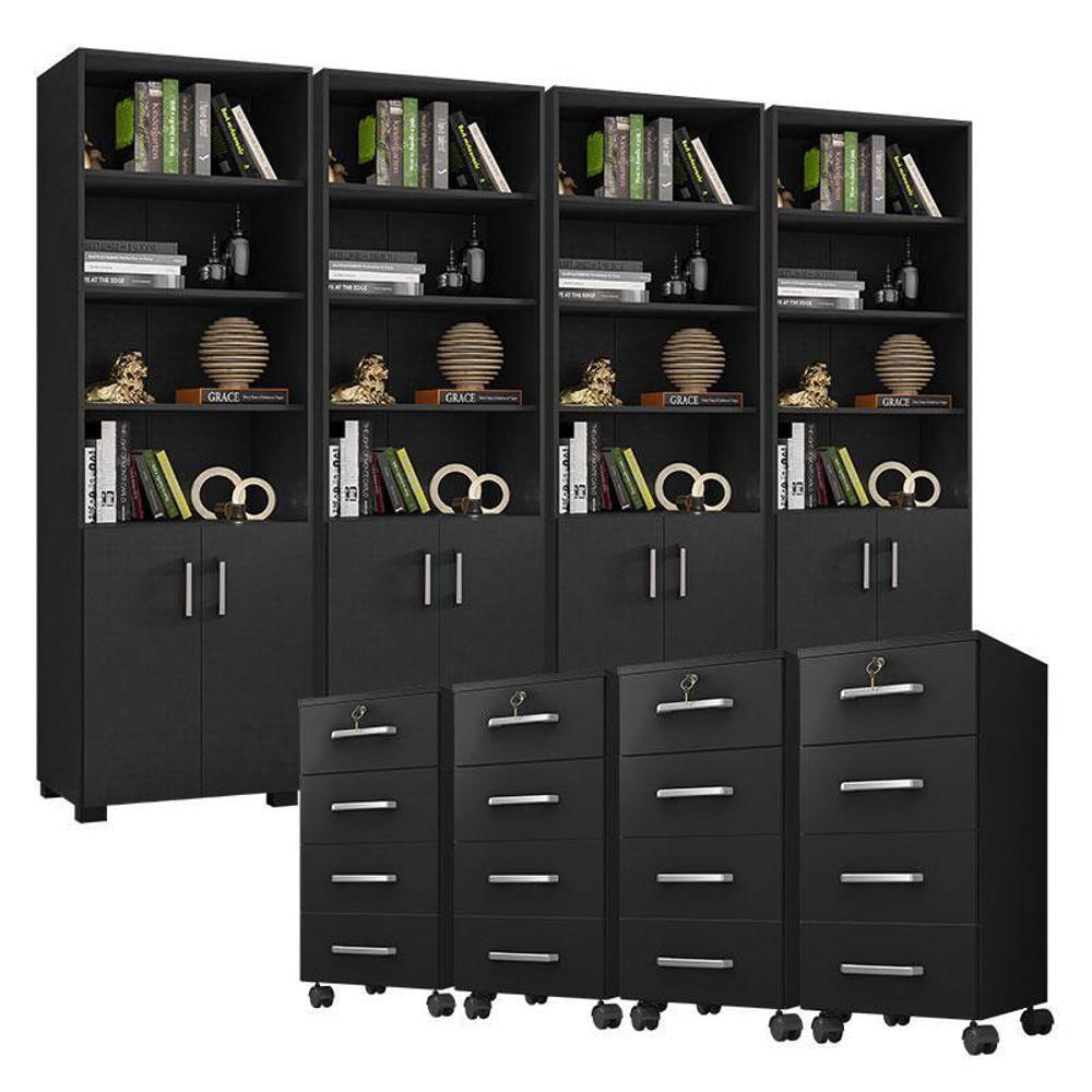 Kit 4 Gaveteiros Para Escritório Gávea Com Chave E 4 Livreiros Office Portas Pequenas Preto Fosco – Móveis Leão