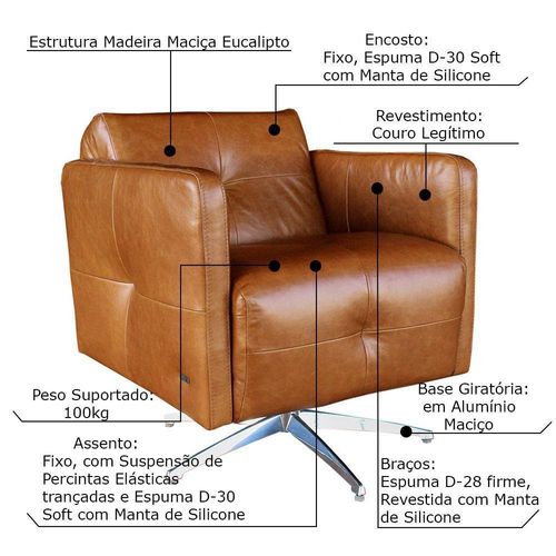 Características do Produto: Estrutura: Madeira Maciça de Eucalipto; Assento: Fixo, com Suspensão de Percintas Elásticas Trançadas e Espuma D-30 Soft com Manta de Silicone; Encosto: Fixo, com Enchimento de Espuma D-30 Soft Revestida com Manta de Silicone; Braços: Espuma D-28 Firme, Revestida com Manta de Silicone; Material do Pé: Base Giratória em Alumínio Maciço; Quantidade de Pés: 05 Pontas Cada; Revestimento: Couro; Cor: Crystal Brown Marrom; Peso Suportado: 100kg Cada; Peso do Produto: 25Kg Cada; Conteúdo da Embalagem: 2 Poltronas; Necessita de Montagem: Não; Garantia: 3 meses contra defeito de fabricação; Instruções/Cuidado: Recomendado somente limpeza com pano umedecido;